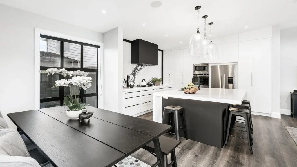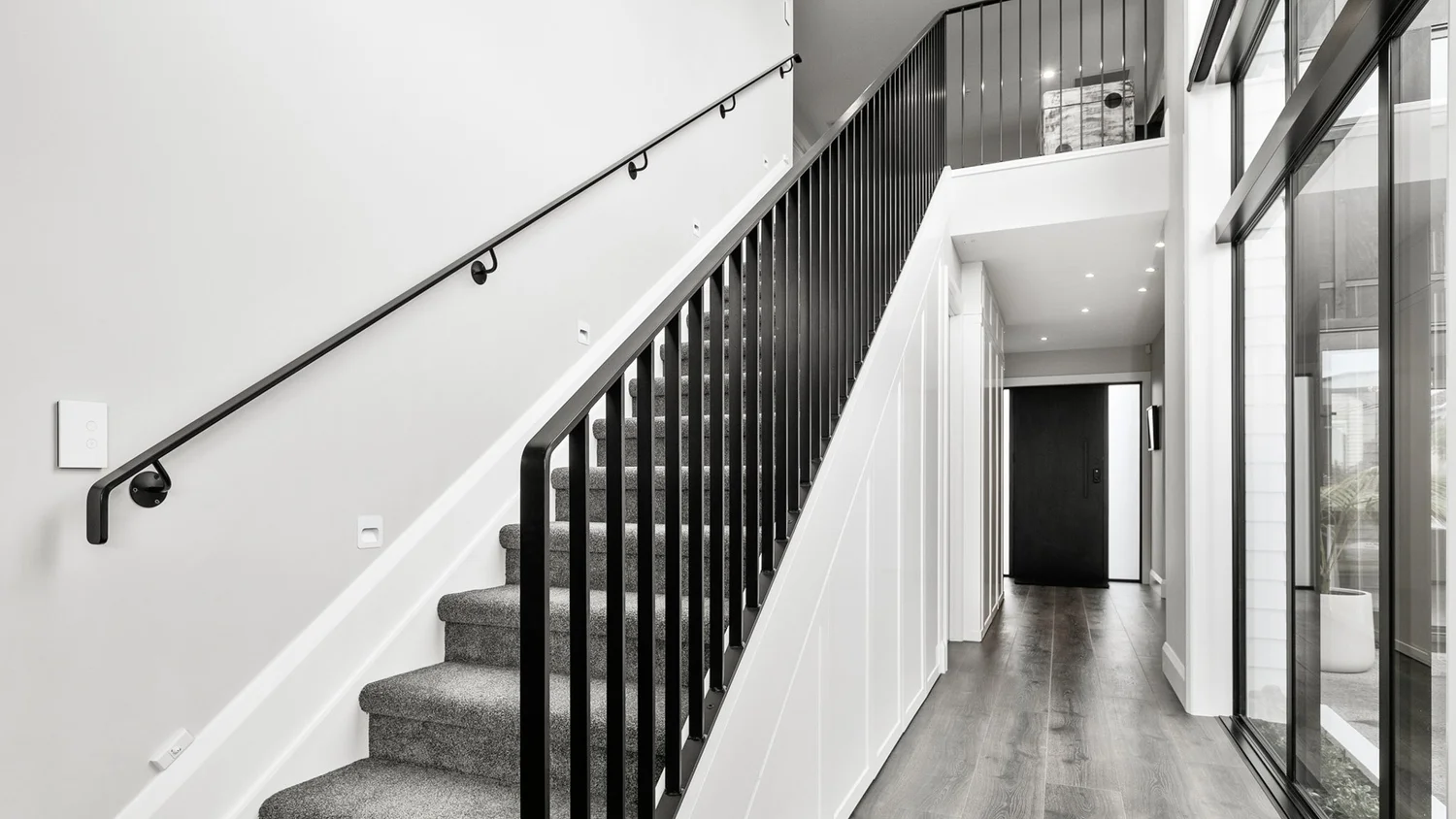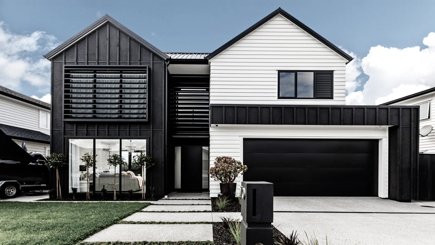 Not content with blending in, this sleek 2-storey 280sm weatherboard in Millwater, Auckland is simply striking for all the right reasons. A pitch roof surrounds the urban oasis within, complete with baby lap pool that hides its cover. Automatic louver roof above the outdoor deck allows for al fresco living all year round. The 2-storey glass wall commands attention and allows the natural light to flood in. Look closely and you may notice the powder room concealed behind the wood paneling feature wall, accessible by an automatic push door off the hallway. Two downstairs lounges provide plenty of chill-out space and the master bedroom offers a private sanctuary with its own deck and spa pool, walk in wardrobe and ensuite bathroom.