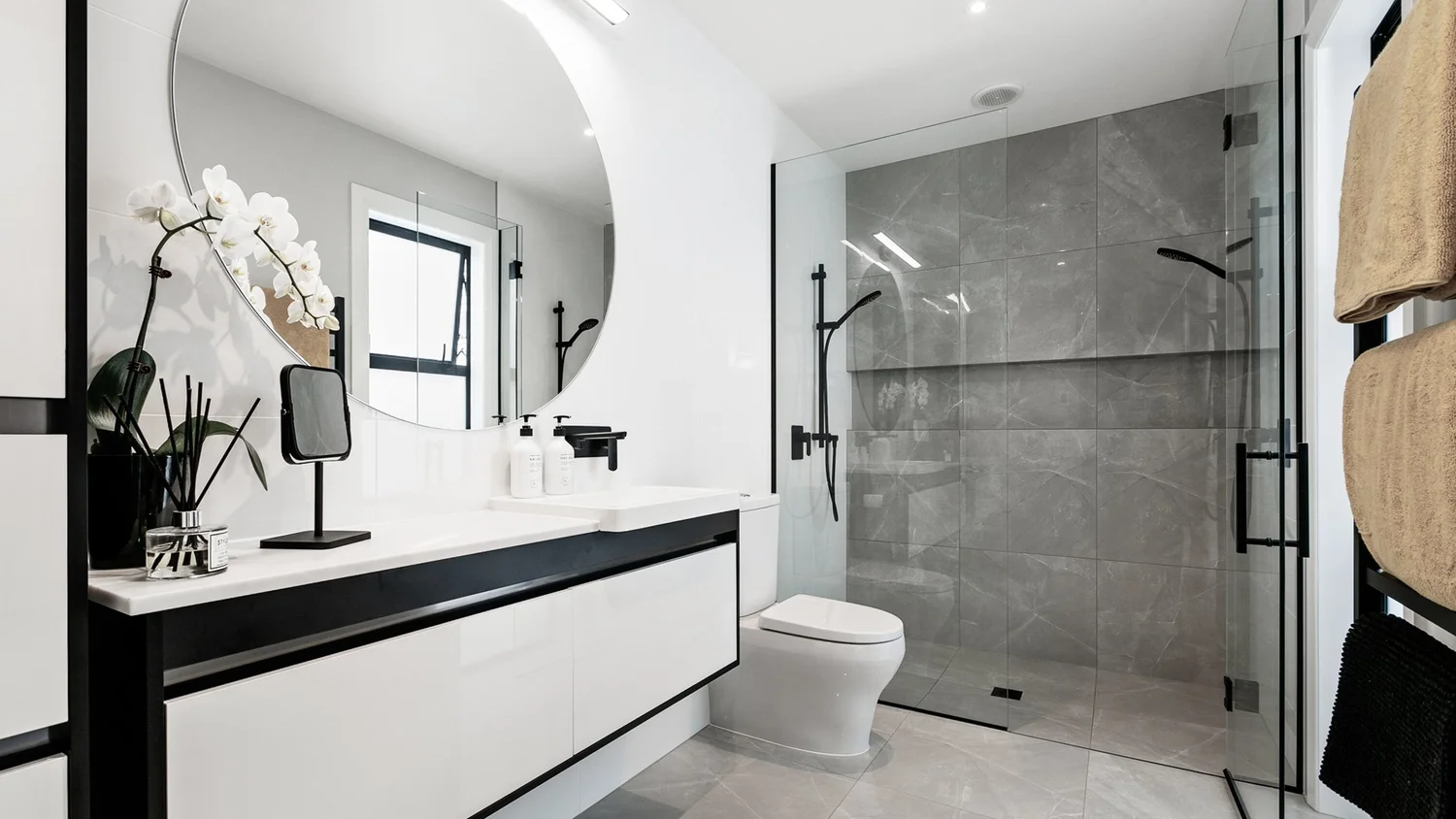 The contemporary black and white kitchen makes a statement with an artistic tile splash-back, offset against minimalist cabinetry that contains a hidden pantry, breakfast nook and a power-drawer to keep the bench device-free. Upstairs easily flows to a self-contained haven with a central third lounge between three generous bedrooms, storage room with laundry shoot to the double garage below and a separate office overlooking the pool. Hi-tech touches include ducted heating and cooling, TV cable boxes behind wall-mounted TV’s, feature lighting around the garden and pool and key-less front door entry pad.