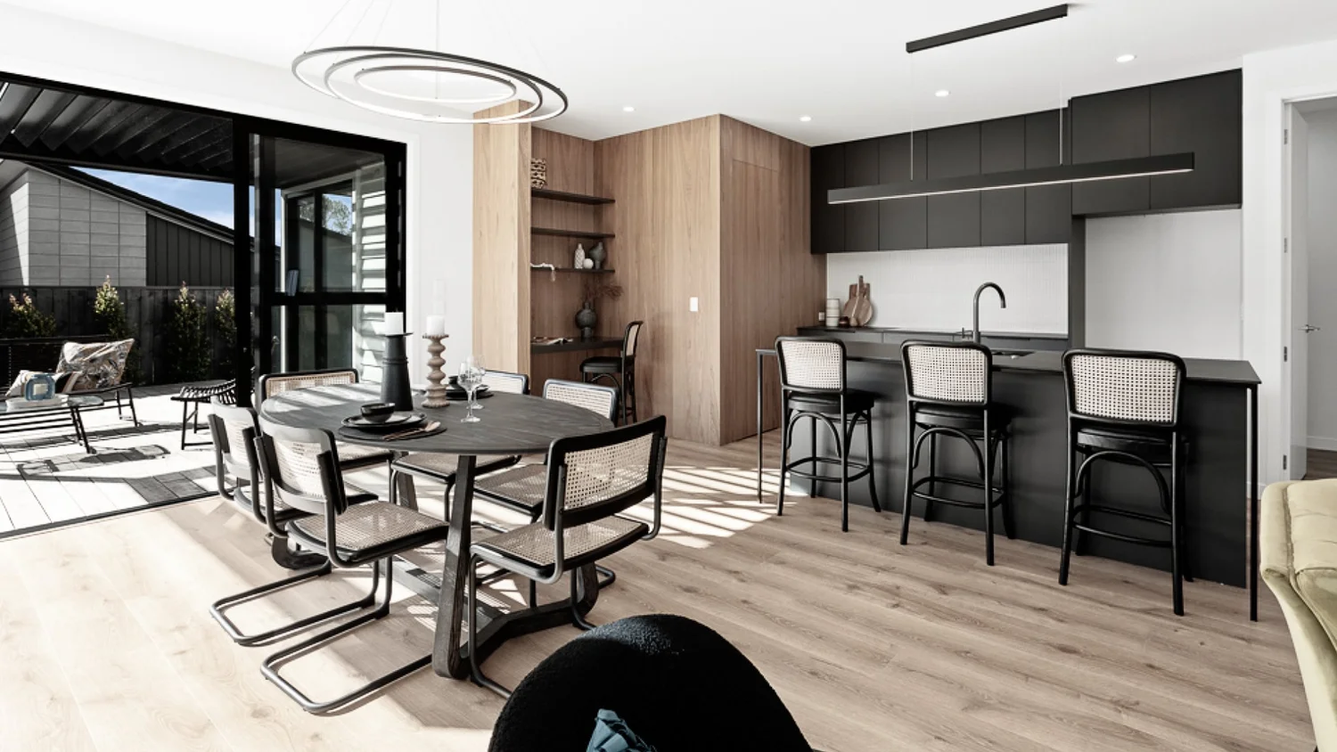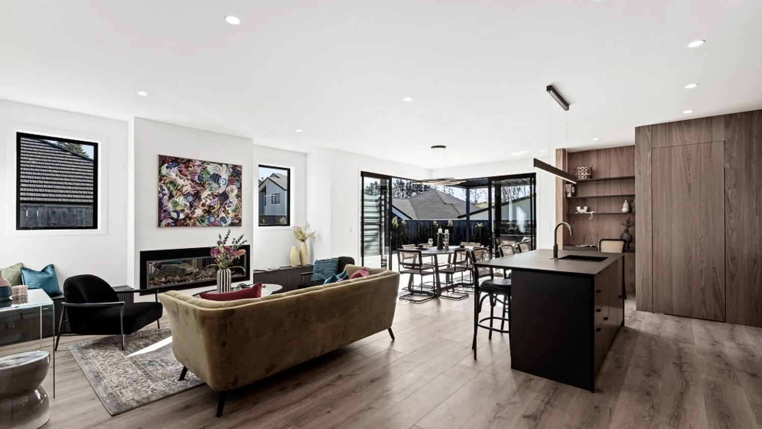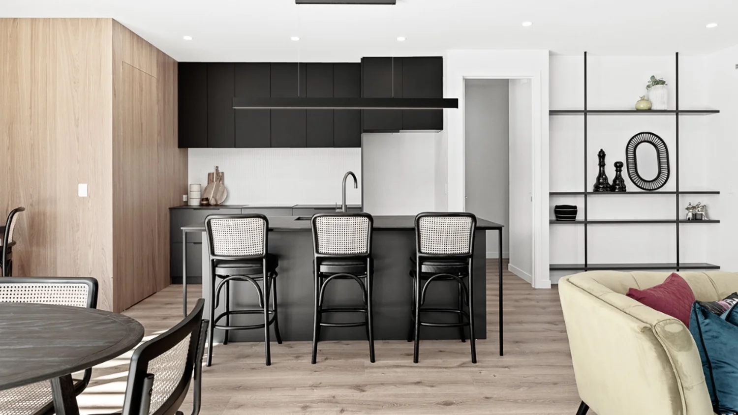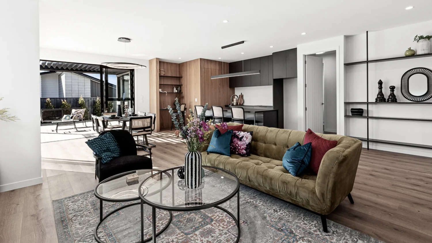 - From the entry a barn door slides to reveal the open-plan living zone, where rich wood pairs with black, white and charcoal, and plush furnishings add pops of vibrant colour. It’s utterly contemporary yet with an ageless charm, and the 2.7m stud helps the whole room feel bright and spacious.
