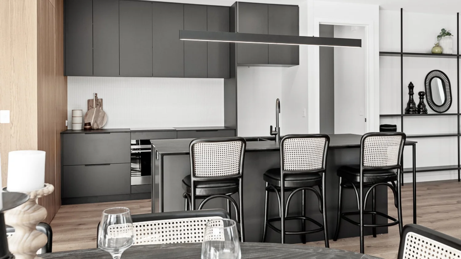 - The kitchen is sleek, with gunmetal taps and sink in perfect harmony with the charcoal of the Dekton benchtop, and subtle matt-black handles almost unseen on the deep drawers that provide plenty of storage. Feature panels of American white oak form angles in the corner, hiding a walk-in pantry on one side and creating a study nook on the other.